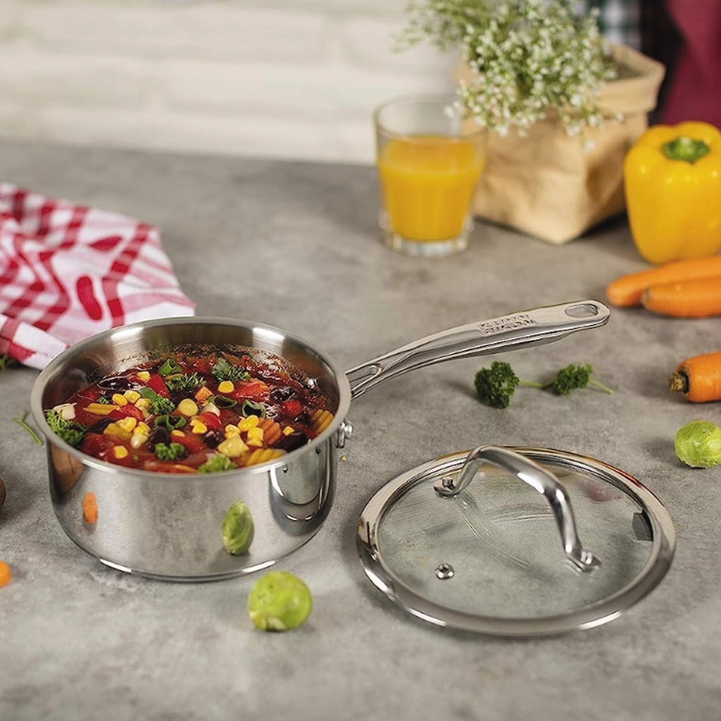 Das elegante Allround Kochgeschirr aus hochwertigem Edelstahl verkörpert Eleganz, Widerstandsfähigkeit und Langlebigkeit.Die Mitte des Edelstahlgriffes ist hohl, wodurch er kühl bleibt und die Handhabung angenehm macht.Der Glasdeckelmit Dampföffnung für bequemes Sichtkochen verhindert unnötigen Wärmeverlust oder ein Vakuum.Durch den dicken Boden wird die Wärme optimal gespeichert und gleichmässig auf das Kochgut verteilt.Ergonomischer Kaltgriffe für eine angenehme HandhabungSichtkochen dank Dampföffnung im GlasdeckelFür alle Herdarten geeignet, Induktion inklusiveDicker Boden sorgt für optimale Wärmespeicherung und -verteilungRobuster, hochwertiger Edelstahl Inox 18/10