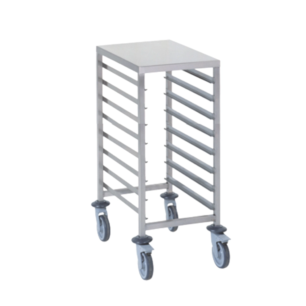Regalwagen mit Arbeitsplatte GN: 1/1, 8 Auflageschiene.Gefertigt aus rostfreiem Edelstahl, Vierkantrohr 25×25 mm. Schienen geschweisst, mit Blockier-Anschlägen an den Enden. 4 Lenkrollen Ø 125 mm, davon 2 mit Feststellerbremsen.Ringförmiger Stossschutz für sicheren Transport.
