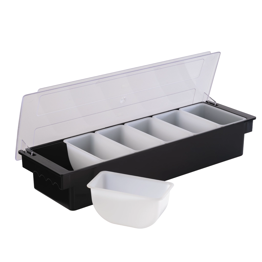 Bac à ingrédients, capacité de 500 ml par compartiment, 6 compartiments, avec couvercle (givré), conçu pour le stockage. Parfait pour tout buffet, bar, comptoir, etc.